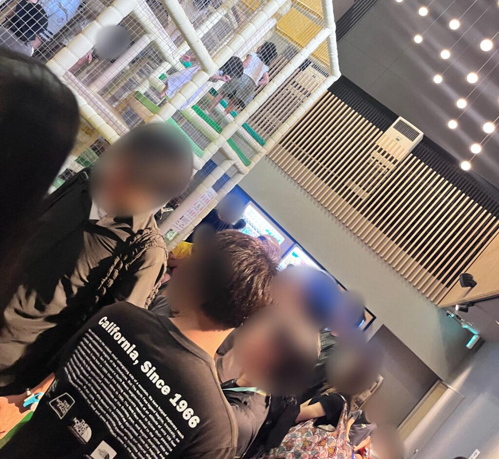 ↓の写真の人がたくさん立っているところは、アスレチックの目の前ですが通路なんです。通路を通りたい人と遊具で遊ぶ子供を見守る人、フードコートの順番待ちをする人であふれています。