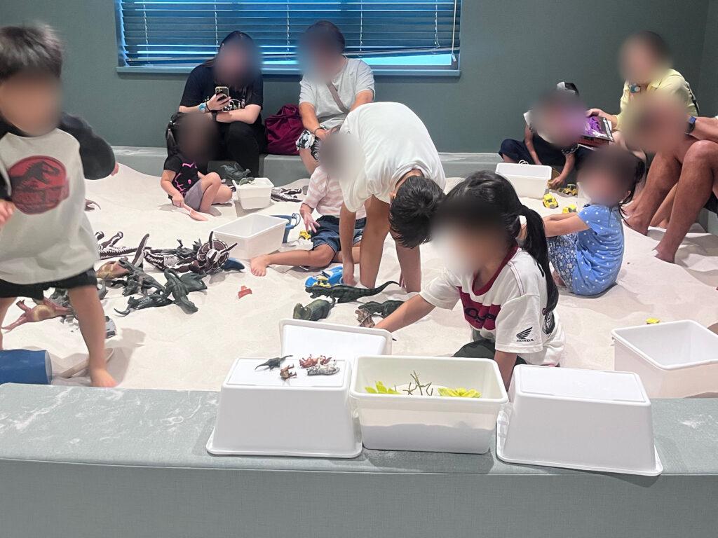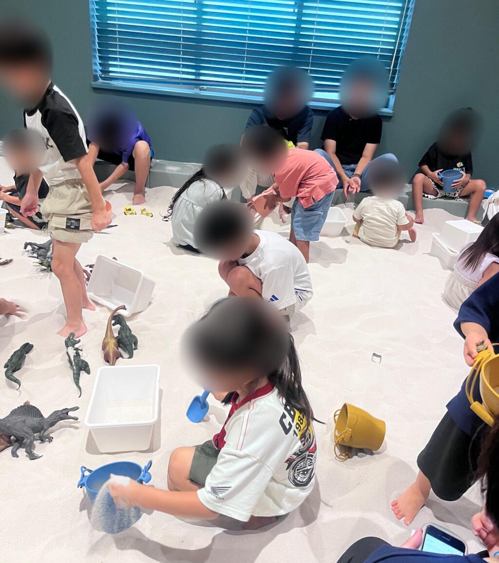 さらさらの白い砂と、恐竜のフィギュアやスコップで遊べます。